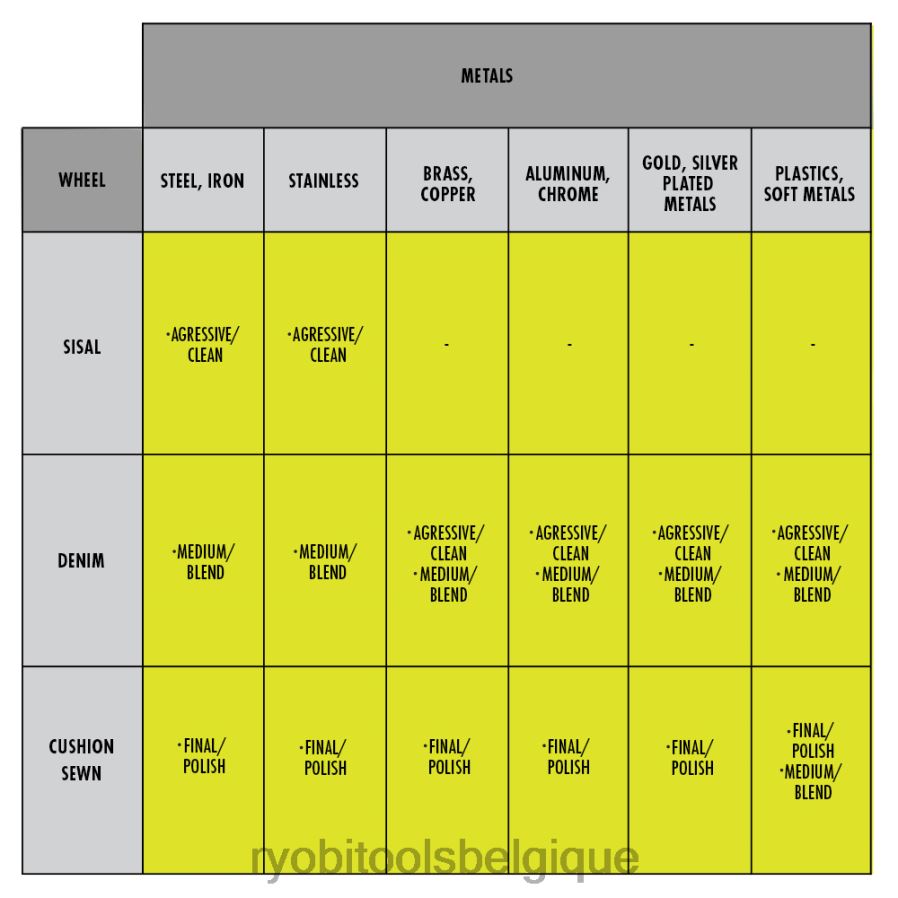 complétez votre collection d’outils avec les 4 pièces. Jeu de meules de polissage et de polissage de 4″. Ces meules de polissage peuvent être utilisées pour plusieurs étapes du processus de polissage et peuvent être utilisées sur une variété de métaux. Ces meules sont compatibles avec les meuleuses d’établi, les perceuses et les visseuses à percussion avec le mandrin inclus. pour le meilleur Résultats à utiliser avec l’ensemble de produits de nettoyage pour métaux Ryobi. Cet ensemble comprend (1) une roue en sisal, (1) une roue en spirale en denim, (1) une roue cousue à coussin et (1) un mandrin à tige hexagonale de 1/4″.