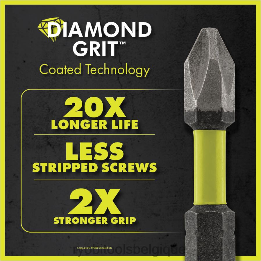 Complétez votre collection d’outils avec la technologie de revêtement Ryobi Diamond Grit. les 5 pièces. Les embouts à percussion de 1″ incluent la technologie de revêtement de grain de diamant. La technologie de revêtement de grain de diamant offre une couche de protection supplémentaire pour une durée de vie 20 fois plus longue, améliorant la durabilité de l’embout dans toutes les applications de vissage Phillips. Le grain de diamant produit une adhérence 2x plus forte qui permet une forte Maintien avant l’enfoncement et mise en place de la fixation dans l’embout. Cette adhérence supplémentaire crée une expérience similaire à celle d’un embout chargé magnétiquement, mais avec une tenue plus sûre. La technologie recouverte de grains de diamant s’accroche à l’attache cruciforme pendant l’entraînement pour un meilleur ajustement afin d’éviter décapage de la tête Phillips. Cet ensemble est une solution parfaite pour tous les bricoleurs et les professionnels à la recherche de lefrustration de vis dénudée en acier inoxydable et contrôle optimal avant l’entraînement. ces 5 pièces. Les embouts à percussion de 1″ sont compatibles avec les perceuses et les visseuses à percussion standard et comprennent (5) embouts diamantés ph2 de 1″