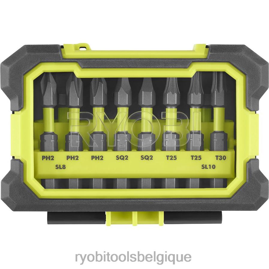 ryobi présente le 10 pc. Jeu d’embouts à percussion avec étui de rangement pour clip de ceinture. ce kit comprend un large assortiment d’embouts résistants aux chocs qui ont une durée de vie 3 fois plus longue. l’étui à clip de ceinture rotatif offre une polyvalence de stockage d’embouts unique. l’étui peut être accroché par un clou ou une cheville sur votre établi, ou clipsé sur votre ceinture pour des tâches mobiles en déplacement. le boîtier transparent vous permet d’identifier facilement vos embouts pour plus d’efficacité à toutes les étapes de votre projet. les embouts de 2 pouces comportent une zone de torsion conçue pour absorber le couple et la demande élevés associés à l’utilisation d’un tournevis à percussion. la bande verte sur les embouts permet de les trouver facilement sur votre établi, votre boîte à outils et votre chantier. cet ensemble comprend (3) 2″ ph2, (2) embouts sq2, (2) torx #25, (1) torx #30, (1) sl8 et (1) sl10.