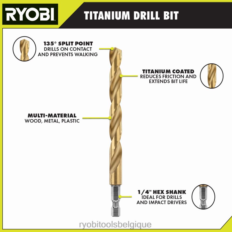 ryobi présente le kit de forets en titane (22 pièces). le jeu de forets Ryobi de 22 pièces avec revêtement en titane constitue un excellent ajout à tout ensemble d’outils. ses embouts ont une taille allant de 1/16 po à 3/8 po et sont tous dotés d’une pointe fendue à 135 degrés qui empêche la marche. tous les forets sont dotés d’une tige hexagonale de 1/4 po pour un changement facile des forets et peuvent être utilisés pour percer du bois, du métal et des matières plastiques. le kit comprend 22 embouts revêtus de titane de 1/16 po à 3/8 po. pour plus de choses sur Ryobi, visitez ryobitools.com.