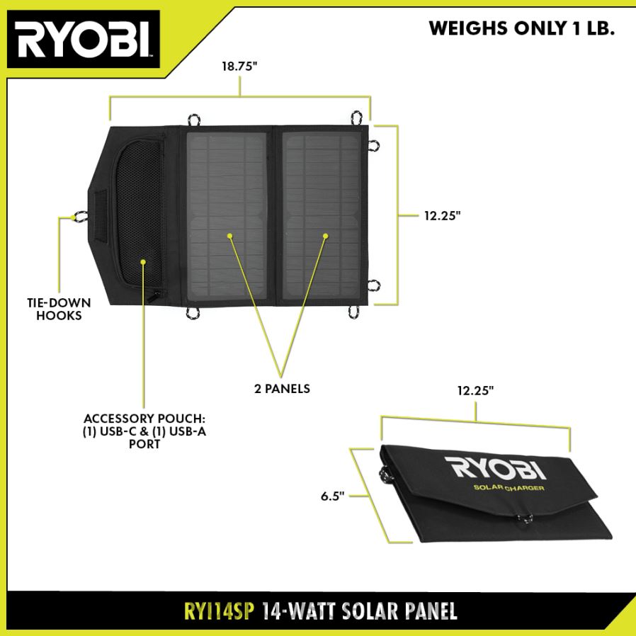 le panneau solaire pliable Ryobi de 14 watts alimente tout petit appareil électronique doté d’un port USB-A ou USB-C directement à partir du soleil. il est idéal pour alimenter vos téléphones, tablettes, banques d’alimentation, haut-parleurs et même vos batteries Ryobi 18 V One+ lorsqu’il est combiné avec une source d’alimentation Ryobi compatible. il peut charger une batterie Ryobi 18v one+ 2ah en moins de 4 heures et votre téléphone en aussi peu que 2 heures et 20 minutes. le panneau solaire de 14 watts maximise la portabilité de votre source d’alimentation, pesant seulement 1 livre et mesurant 12,15” x 6,5” une fois plié. la conception compacte, légère et pliable facilite le stockage et le transport, de sorte que vous pouvez l’emporter avec vous pour charger des appareils lors de la randonnée, du camping, à la plage et partout sous le soleil où vous auriez besoin d’une alimentation portable. ça peut être ouvertposé à plat sur le sol pour capturer la lumière pendant les heures de pointe d’ensoleillement, ou peut être suspendu à différents angles à l’aide des (7) boucles de suspension intégrées pour maximiser la quantité de lumière qu’il capture. le panneau solaire Ryobi de 14 watts bénéficie de la garantie fabricant Ryobi de 3 ans et comprend le panneau solaire pliable ryi14sp de 14 watts et un manuel d’utilisation.