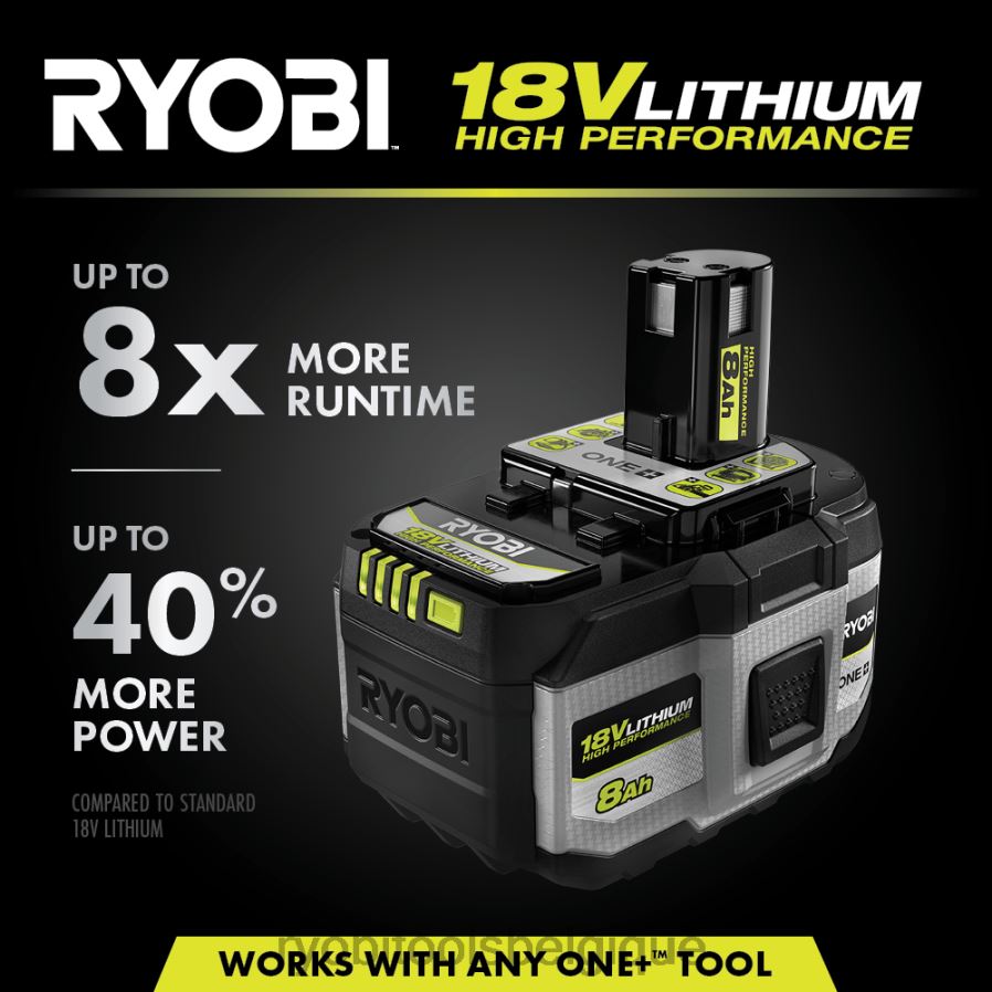 développez votre système Ryobi 18v one+ avec la batterie haute performance au lithium 18v one+ 8ah. cette batterie de 8 Ah est dotée de 21 700 cellules haut de gamme qui, combinées à notre technologie Intelcell, fournissent jusqu’à 40 % de puissance en plus et jusqu’à 8 fois plus d’autonomie, augmentant ainsi l’efficacité globale. avec cette batterie, vous pouvez effectuer plus de 300 coupes transversales par charge sur du pin jaune 2×6 à l’aide de notre scie circulaire sans balais one+ hp de 7-1/4”. notre système de gestion de la chaleur cool-core pro utilise des sangles cellulaires robustes soudées au laser et des dissipateurs thermiques améliorés pour réduire la température pendant l’utilisation. cela optimisera les performances, permettant à la batterie de fonctionner 30 % plus froidement, de vivre 50 % plus longtemps et de fournir une puissance sans évanouissement dans toutes les conditions. un surmoulage durable supplémentaire augmente la protection sur et hors du chantier. lela conception robuste et la technologie anti-vibration augmentent la durabilité et améliorent l’expérience utilisateur lors d’applications exigeantes. la jauge de carburant LED haute visibilité indique clairement l’autonomie restante. Associez cette batterie au lithium haute performance à n’importe quel outil 18 V One+ HP pour plus de puissance, une durée de fonctionnement plus longue et la meilleure expérience globale sur le système 18 V One+. fait partie du système Ryobi One+ – n’importe quelle batterie 18 V One+ fonctionne avec n’importe quel produit 18 V One+. cette batterie haute performance au lithium 18 V one+ 8ah bénéficie de la garantie fabricant Ryobi de 3 ans et comprend (1) batterie haute performance pbp1008 18 V one+ 8ah et un manuel d’utilisation. chargeur vendu séparément.
