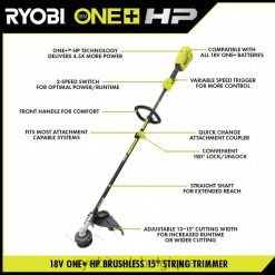 le coupe-bordure Ryobi 18v one+ hp sans balais de 15 pouces avec accessoires est la meilleure combinaison de puissance et de polyvalence .il est doté d’un moteur sans balais pour une puissance et une durabilité maximales.la capacité d’accessoires extensibles vous permet de transformer votre coupe-bordure, un souffleur, une scie à perche et bien d’autres outils avec les accessoires disponibles, ce qui signifie que vous pouvez gagner du temps, de l’espace et de l’argent. Cette tondeuse est équipée de la tête d’alimentation Reel Easy+ avec manivelle d’enroulement rapide qui peut être rechargée en 60 secondes ou moins. La gâchette à vitesse variable et l’interrupteur à 2 vitesses offrent un contrôle accru pour toute application. Le réglage de 13″ à 15 ” La largeur de coupe vous permet d’optimiser votre tondeuse pour augmenterdurée d’exécution ou une largeur de coupe plus large. cette conception légère et bien équilibrée dispose également d’une poignée avant pour plus de confort et la tondeuse est équipée d’une batterie de 6,0 Ah pour une autonomie prolongée. la batterie est compatible avec le système ryobi one+. bénéficiant d’une garantie de 3 ans.