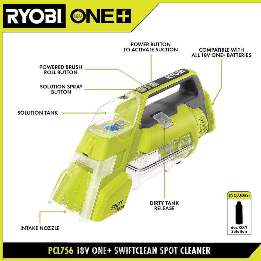 étendez votre système Ryobi 18v one+ avec le kit de nettoyage de taches Swiftclean 18v one+. le Swiftclean est prêt pour les déversements et les dégâts quotidiens. récupérez votre Swiftclean sans fil et laissez les brosses à main dans le garage, ainsi que les maux de dos qui accompagnent les méthodes de nettoyage manuelles traditionnelles. ce nettoyant pour taches est idéal pour les nettoyages de déversements frais. la brosse à récurer motorisée agite et soulève les débris pour un nettoyage sans effort des tissus d’ameublement, des sièges d’auto, des escaliers, des tapis et plus encore. la portabilité sans fil et la conception légère sont parfaites pour nettoyer les dégâts immédiats afin d’éviter les taches incrustées. la commodité du Ryobi Swiftclean est d’avoir le pouvoir de tout faire avec une alimentation sans fil ; Pulvérisez précisément la solution, agitez avec la brosse motorisée, puis soulevez la tache avec la poudre.une aspiration efficace. la solution de nettoyage Ryobi Oxy de 6 oz incluse est une formule prête à l’emploi, ce qui signifie qu’il n’y a pas de dilution, pas de mélange et pas de tracas. tous les composants transparents de votre Swiftclean vont au lave-vaisselle dans le panier supérieur pour un entretien et un nettoyage faciles des outils. ce kit de nettoyage de taches Swiftclean 18 V bénéficie de la garantie fabricant Ryobi de 3 ans et comprend une batterie au lithium 18 V 2 Ah, un chargeur et une bouteille de 6 oz de solution de nettoyage Ryobi Oxy. Une solution d’oxy supplémentaire peut être trouvée sur homdepot.com en recherchant le numéro de modèle a32s056.