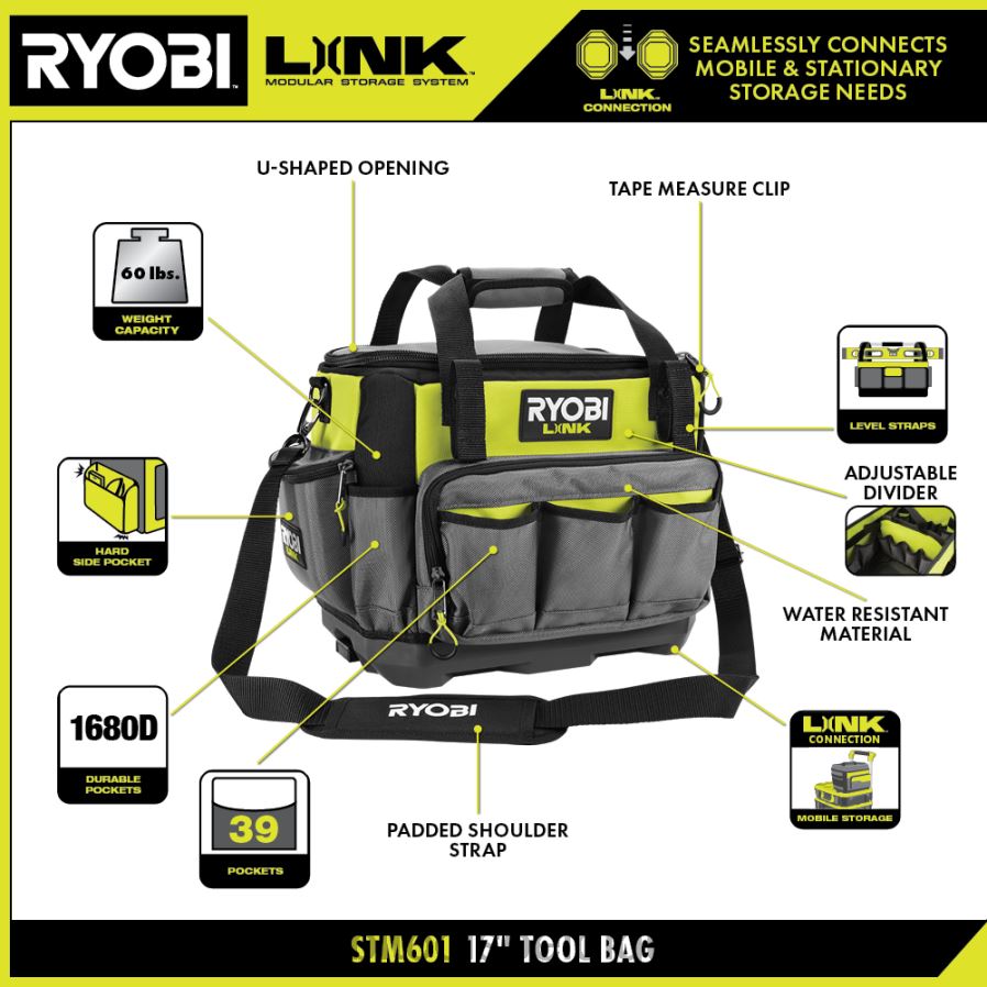 le système de stockage modulaire Ryobi Link révolutionne l’industrie du stockage, vous permettant d’organiser, d’accéder et de transporter votre vie. le sac à outils Ryobi Link 17″ est conçu pour gérer les situations les plus difficiles. La capacité de poids de 60 lb, les poches robustes 1680d et le matériau résistant à l’eau protègent vos outils pendant le transport. L’organisation est infinie avec 39 poches intérieures et un séparateur réglable. la poche latérale rigide offre une protection supplémentaire pour les téléphones ou les lunettes tandis que les sangles de niveau intégrées et le clip pour mètre à ruban maintiennent ces objets facilement accessibles. transportez-le à l’aide de la poignée supérieure ou de la bandoulière rembourrée incluse. l’ouverture en forme de U offre une capacité de stockage maximisée et un expérience améliorée pour afficher tous les contenus sans creuser.Surtout, il fait partie de la gamme de produits du système de stockage modulaire Ryobi Link qui utilise la même technologie de verrouillage pour connecter de manière transparente vos besoins de stockage mobiles et fixes. Possédez votre espace avec le système de stockage modulaire Ryobi Link.