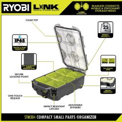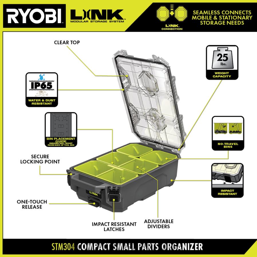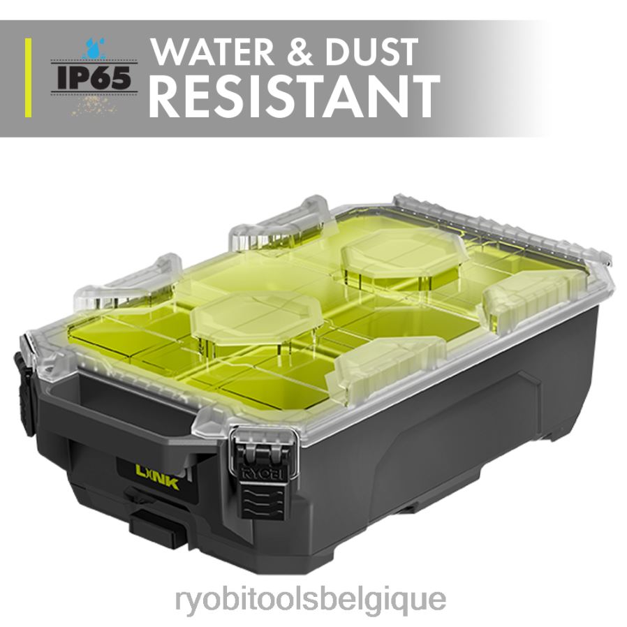 le système de stockage modulaire Ryobi Link révolutionne l’industrie du stockage, vous permettant d’organiser, d’accéder et de transporter votre vie. l’organisateur de petites pièces compact Ryobi Link permet de ranger les outils dans les situations les plus difficiles, entièrement équipé d’un matériau résistant aux chocs et d’une capacité de charge de 25 lb. sécurisez le stockage de vos outils portables avec l’indice IP65 qui protège vos articles de l’eau et de la poussière dans n’importe quel environnement. le compartiment intégré pour outils à main et les bacs de rangement sans voyage offrent une organisation maximale de stockage des outils Ryobi, gardant tout à sa place. identifiez rapidement ce qu’il y a à l’intérieur grâce au dessus transparent et sécurisez vos articles avec un point de verrouillage. c’est le complément parfait à votre gamme de boîtes à outils mobiles. Mieux encore, il fait partie de la gamme de systèmes de stockage modulaires Ryobi Link.des produits qui utilisent la même technologie de verrouillage pour connecter de manière transparente vos besoins de stockage mobiles et fixes. Possédez votre espace avec le système de stockage modulaire Ryobi Link.
