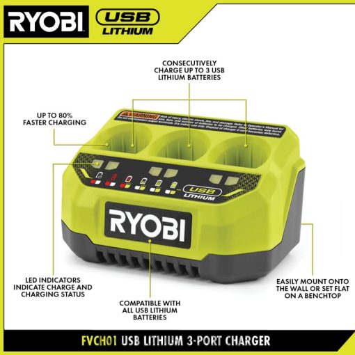 étendez votre système Ryobi USB Lithium avec le chargeur USB Lithium à 3 ports. avec une charge jusqu’à 80 % plus rapide que le câble USB Ryobi, ce chargeur réduit considérablement les temps d’arrêt. conçu dans un souci de commodité, il peut charger et entretenir consécutivement jusqu’à 3 batteries au lithium USB. doté de voyants LED, les utilisateurs peuvent facilement identifier l’état de charge de la batterie. le mode d’économie d’énergie conserve l’énergie lorsque vous ne chargez pas ou n’entretenez pas les batteries. pour maximiser l’espace de travail, la capacité de montage mural garantit l’organisation à tout moment. Mieux encore, il fait partie du système USB au lithium qui fournit des solutions compactes, portables et rechargeables pour une alimentation et une productivité sans fil. ce chargeur USB au lithium à 3 ports bénéficie de la garantie du fabricant Ryobi de 2 ans et comprend (1) chargeur USB au lithium à 3 ports fvch01.et le manuel de l’opérateur. batterie vendue séparément.