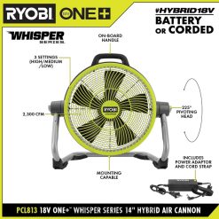 étendez votre système Ryobi 18v one+ avec le canon à air brumisateur hybride ryobi 18v one+ 12″. Avec jusqu’à 1 400 cfm et jusqu’à 15′ de portée de pulvérisation, le canon à air brumisateur hybride ryobi 18v one+ 12″ est la solution de refroidissement ultime. Faisant partie de la série Whisper de Ryobi, le canon à air brumisateur hybride ryobi 18v one+ 12″ est inclus dans notre gamme de produits la plus silencieuse. Le canon à air brumisateur hybride ryobi 18v one+ 12″ permet une installation et une utilisation faciles en se connectant à votre tuyau d’arrosage standard pour capacité de brumisation, une tête pivotante et un interrupteur haut/bas pour un débit d’air personnalisable, le canon à air de brumisation hybride 18v one+ 12″ peut être utilisé comme un ventilateur puissant lorsque la fonction de brumisation n’est pas utilisée pour une polyvalence ultime de l’utilisateur. ce 18v one+ 12 ” Le canon à air brumisateur hybride bénéficie de la garantie fabricant Ryobi de 3 ans et comprend(1) canon à air brumisateur hybride pcl850 18v one+ 12″ et (1) manuel d’utilisation. batterie et chargeur vendus séparément.