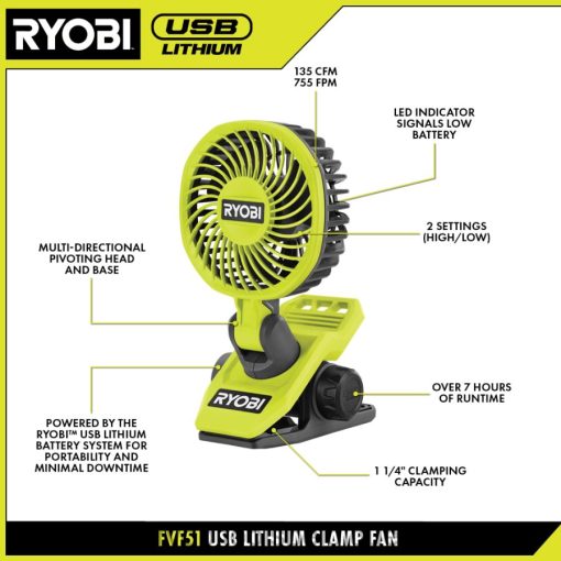 éclairage style de vie et loisirs RYOBI kit de ventilateur à pince au lithium usb 486FN493