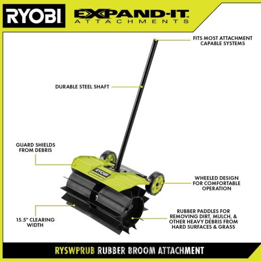 Agrandissez votre système Ryobi avec l’accessoire de balai en caoutchouc Ryobi Expansion-it. dans le cadre du système de fixation ryobi expand-it, transformez facilement votre coupe-bordure capable de fixation en un balai en caoutchouc, économisant de l’argent, du temps et de l’espace. ce balai en caoutchouc élimine la saleté, le paillis et autres débris lourds grâce à ses palettes en caoutchouc des surfaces dures et de l’herbe. avec une largeur de déblaiement de 15,5”, vous pouvez rapidement faire le travail. il est équipé d’un arbre en acier durable, d’une protection pour protéger des débris et de roues pour un transport et un fonctionnement confortables. le balai en caoutchouc Ryobi expand-it est compatible avec la plupart des systèmes compatibles avec des fixations à gaz et sans fil. il bénéficie de la garantie fabricant Ryobi de 3 ans et comprend un balai en caoutchouc Ryswprub, une poignée en J avec le matériel, des roues et un manuel d’utilisation.