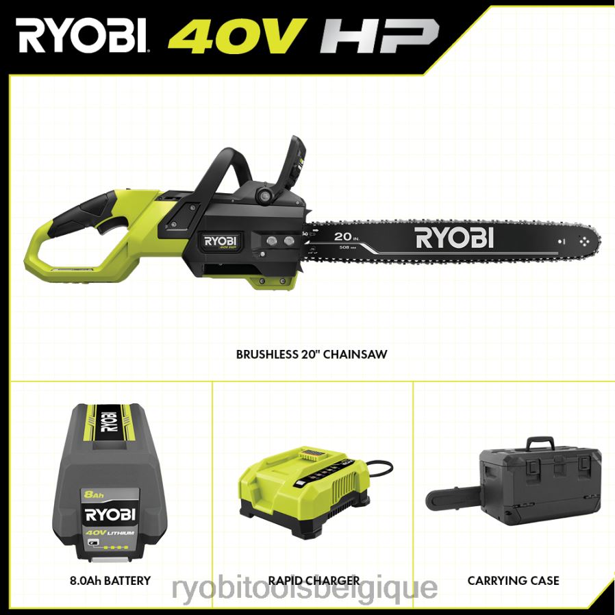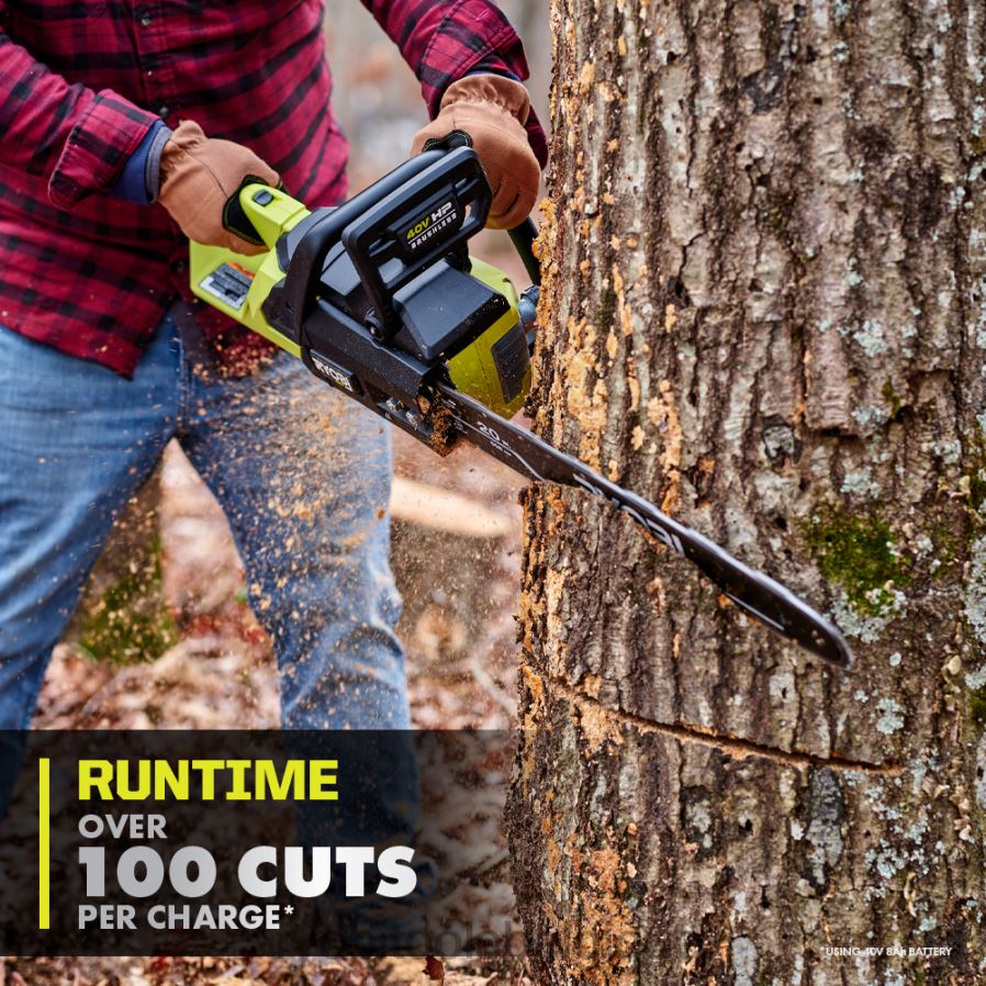 entrez dans le système Ryobi 40 V avec le kit de tronçonneuse sans balais de 20 pouces de 40 V HP. La technologie 40 V HP fournit plus de puissance qu’une tronçonneuse à essence de 50 cc, faisant de cette tronçonneuse un véritable remplacement au gaz. Cette tronçonneuse permet plus de 100 coupes par charge et est équipée d’une chaîne complète haut de gamme. La technologie 40 V combine un moteur sans balais, une électronique avancée et une technologie au lithium haute performance pour fournir plus de puissance, une durée de fonctionnement plus longue, une coupe plus rapide et une plus grande durabilité. “Le guide-chaîne et la chaîne coupent jusqu’à 36”, ce qui la rend idéale pour l’abattage, le tronçonnage et l’ébranchage. Cette tronçonneuse est dotée d’un graisseur automatique pour maintenir la chaîne lubrifiée pour une durée de vie plus longue et d’un frein de chaîne mécanique supplémentaire pour la protection contre le rebond. votre chaîne pour des coupes contrôlées et nettes à l’aide du chai à outilsn mise en tension avec rangement d’outils embarqué. Mieux encore, elle fait partie du système Ryobi 40 V où n’importe quelle batterie 40 V fonctionne avec n’importe quel produit 40 V. ce kit de tronçonneuse sans balais 40 V HP de 20 pouces est couvert par la garantie du fabricant sur les outils Ryobi de 5 ans, la garantie de la batterie du fabricant de 3 ans et comprend une tronçonneuse ry405011 de 20 pouces sans balais de 40 V HP, une batterie au lithium op4080a 40 V 8 Ah, un chargeur rapide OP406a 40 V, fourreau, clé mixte, étui de transport et manuels d’utilisation.