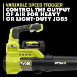 étendez votre système Ryobi 40 V avec le kit de ventilateur à jet 40 V. avec plus de puissance qu’un souffleur à gaz de 25 cc, ce souffleur sans fil offre des performances exceptionnelles sans gaz ni entretien requis. profitez jusqu’à 15 minutes d’autonomie grâce à la batterie au lithium 40 V 4 Ah incluse. la conception du ventilateur à jet fournit 525 cfm et 110 mph en appuyant simplement sur une gâchette, ce qui le rend parfait pour éliminer les feuilles humides/sèches et les débris légers de jardin. contrôlez facilement la sortie d’air avec la gâchette à vitesse variable et le bouton turbo, de sorte que vous pouvez revenir en arrière dans les zones délicates et mettre sous tension lorsque vous éliminez des débris tenaces. Mieux encore, elle fait partie du système Ryobi 40 V où n’importe quelle batterie 40 V fonctionne avec n’importe quel produit 40 V. ce ventilateur 40 V bénéficie de la garantie du fabricant Ryobi de 5 ans et duLa batterie incluse bénéficie de la garantie Ryobi de 3 ans sur la batterie. ce kit comprend le souffleur ry40408 40 V, la batterie au lithium op40404 40 V 4 Ah, le chargeur op404 40 V, le tube de soufflage et les manuels d’utilisation.