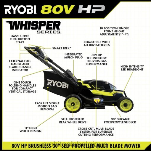 Extérieur RYOBI Tondeuse à gazon automotrice à coupe croisée, série 30, sans balais, 80 V HP 486FN233