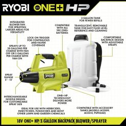 - Pulvérisez jusqu’à 28 gallons par charge avec le ventilateur éteint ou 5 gallons par charge avec le ventilateur allumé avec une batterie Ryobi 18v one+ 2ah