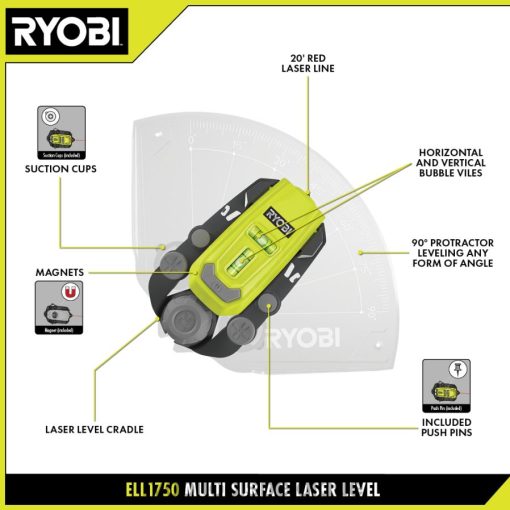 le niveau laser multi-surfaces Ryobi est un produit nouveau et innovant pour tous vos projets de nivellement. il est équipé de 3 options de montage pour une mise à niveau mains libres : ventouses, broches et aimants. le niveau laser multi-surfaces est doté d’un rapporteur à 90 degrés pour niveler avec précision tout ce qui présente un angle. Mesurant jusqu’à 20 pieds, ce niveau laser multi-surfaces Ryobi garantit la précision et la commodité dont vous avez besoin pour accomplir le travail.