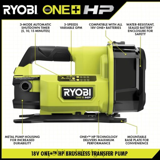 la pompe de transfert d’eau Ryobi 18v one+ hp est idéale pour déplacer l’eau des zones indésirables vers un autre endroit. la technologie hp avec un moteur sans balais permet à la pompe de transfert d’atteindre un débit impressionnant de 10 gpm à 1/4 de puissance. cette pompe peut être utilisée pour une variété d’applications avec une hauteur de tête de 54′ et une hauteur de levage de 17′. Aidez à améliorer la durée de fonctionnement et à prolonger la durée de vie de la pompe grâce à l’utilisation de la minuterie d’arrêt automatique à 3 modes avec des réglages à 5, 10, 15 minutes ou du capteur d’arrêt automatique qui détecte lorsqu’aucune eau n’est détectée. la pompe de transfert offre 3 vitesses variables par minute pour réduire les tâches délicates comme le déplacement d’une petite quantité d’eau ou utiliser la totalité de 10 gpm pour déplacer de plus grandes quantités d’eau. le boîtier de la pompe en métal et le boîtier de batterie scellé et résistant à l’eau garantissent la longévité et la sécurité du transpompe de transfert. la plaque de base montable permet un rangement pratique ou un déplacement d’eau sans effort sans avoir à transporter la pompe avec vous. le filtre d’admission inclus permet à la pompe de drainer le niveau d’eau jusqu’à 1/16″. La pompe de transfert d’eau Ryobi 18 V One+ HP est livrée avec une batterie 18 V One+ 2 Ah et une garantie limitée de 3 ans.
