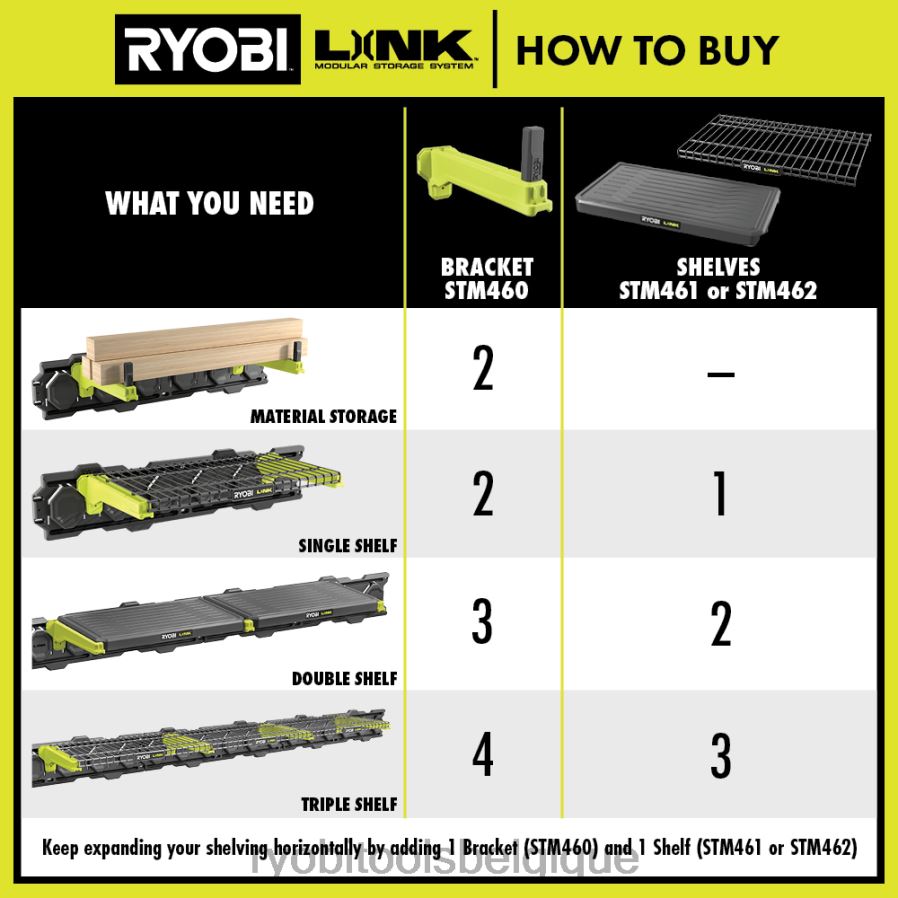 le système de stockage modulaire Ryobi Link révolutionne l’industrie du stockage, vous permettant d’organiser, d’accéder et de transporter votre vie. l’étagère métallique ryobi link 21″ est conçue pour être utilisée avec les supports d’étagère link 2-en-1. utilisez deux supports 2-en-1 pour maintenir une étagère ou ajoutez un troisième support pour maintenir deux étagères l’une à côté de l’autre, partageant le support central, offrant 3,5 ‘ d’espace d’étagère. continuez à étendre votre système d’étagères en ajoutant un support supplémentaire et une étagère dans une rangée. les étagères sont surélevées au-dessus des supports pour permettre aux crochets d’être placés sur le rail mural sous l’étagère pour un rangement supplémentaire. la conception en forme de fil offre une ventilation supplémentaire, gardant tous vos matériaux au sec. Mieux encore, il fait partie de la gamme de produits du système de stockage modulaire Ryobi Link qui utilise le sUne même technologie de verrouillage pour connecter de manière transparente vos besoins de stockage mobiles et fixes. Possédez votre espace avec le système de stockage modulaire Ryobi Link.
